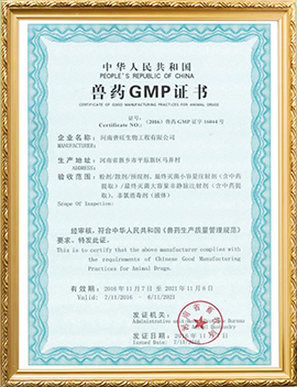 2011年:GMP二期顆粒劑、液體消毒劑、滅菌大容量注射劑、口服溶液劑四條生產(chǎn)線,一次性以全優(yōu)成績(jī)順利通過(guò)國(guó)家農(nóng)業(yè)部專家組GMP驗(yàn)收;