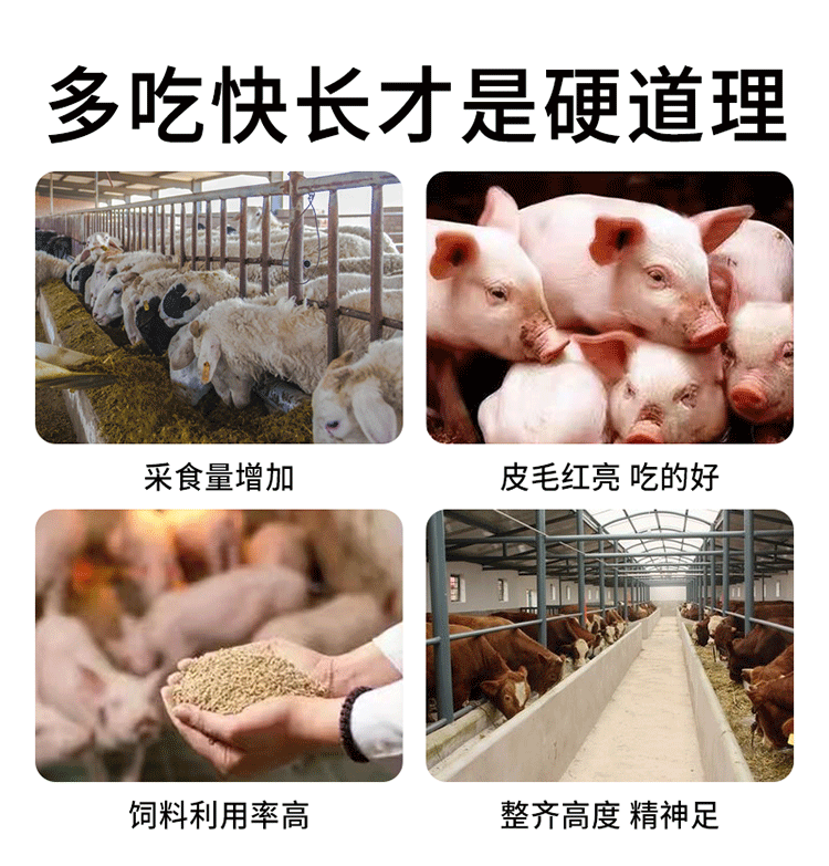 產品簡介:3天看采食,7天看糞便,15天皮紅毛亮,吃完就睡!長期添加提前20-30天出欄,每頭豬多賺500元;