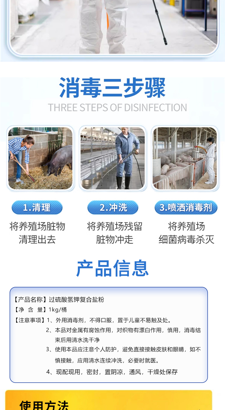 兌水噴灑:1::200的比例兌水噴灑(帶豬消毒);