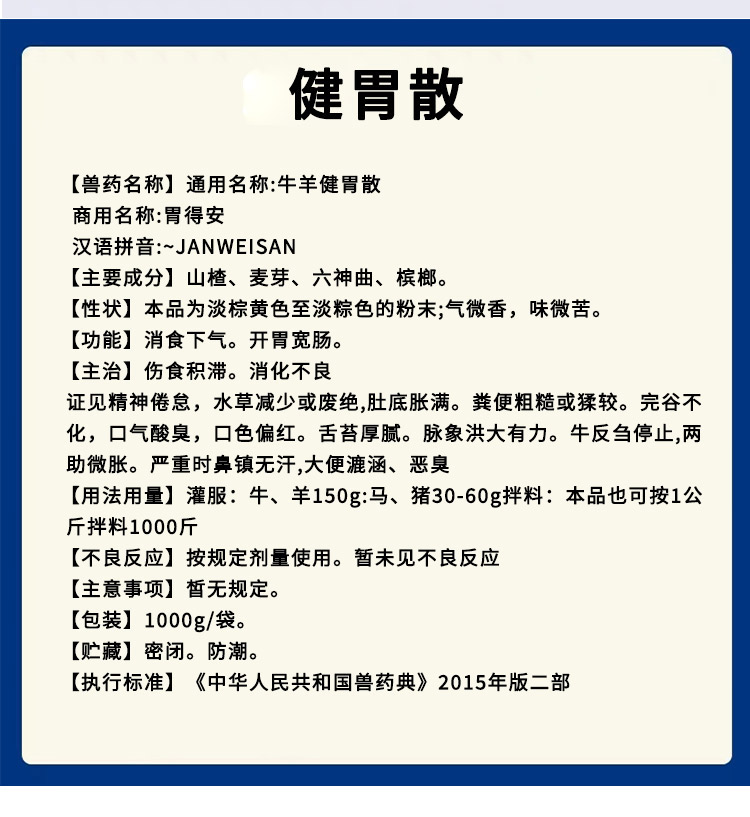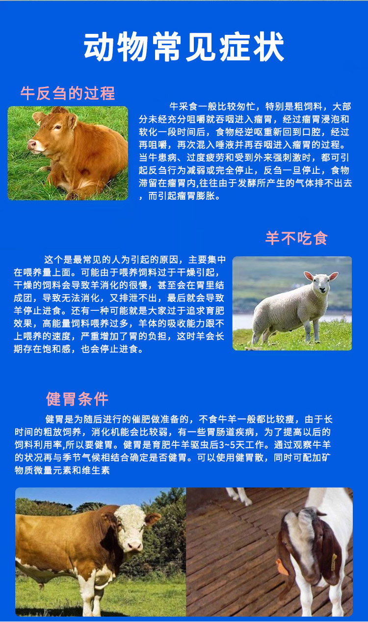【主治】傷食積滯,消化不良。癥見精神倦怠,水草減少或廢絕,肚腹脹滿,糞便粗糙或稀軟,完谷不化,口氣酸臭,口色偏紅,舌苔厚膩,脈象洪大有力。牛反芻停止,兩肋微脹,嚴重時鼻鏡無汗,大便瀉溏、惡臭。