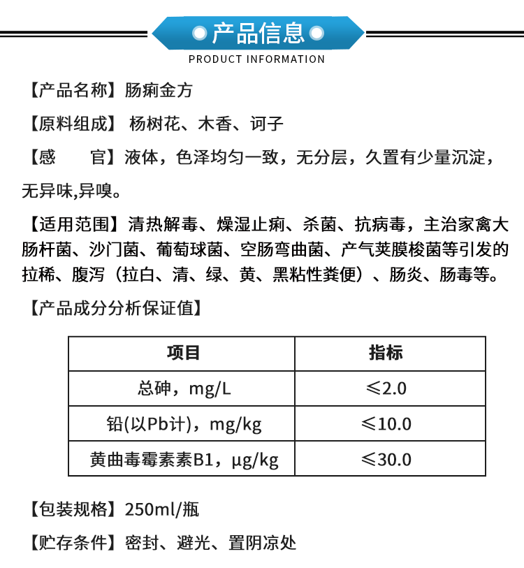 產品簡介:適用于家禽大腸桿菌,拉黃白綠青粘性糞便,腸炎腸毒等。