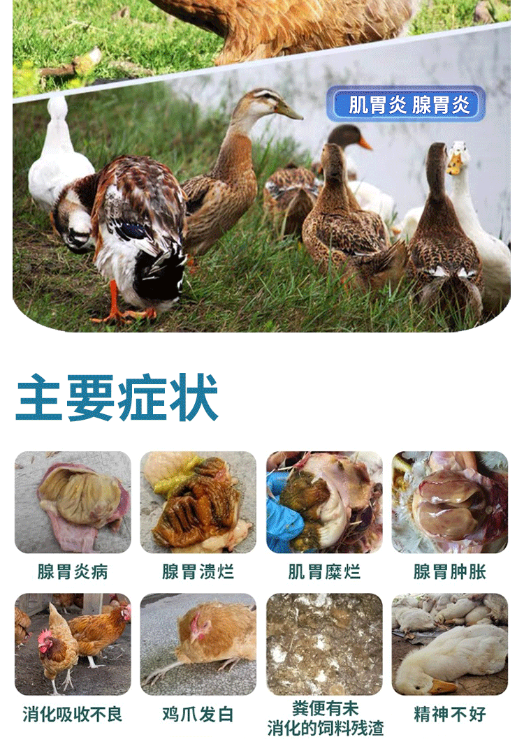 【適用范圍】益氣消腫,健脾、健胃開食、清胃、平肝、強腎、解毒護心的作用,從而達到平衡陰陽,體病同治的作用,臨床對于肌胃炎、腺胃炎、采食量下降,免疫抑制,病毒感染有很好療效。