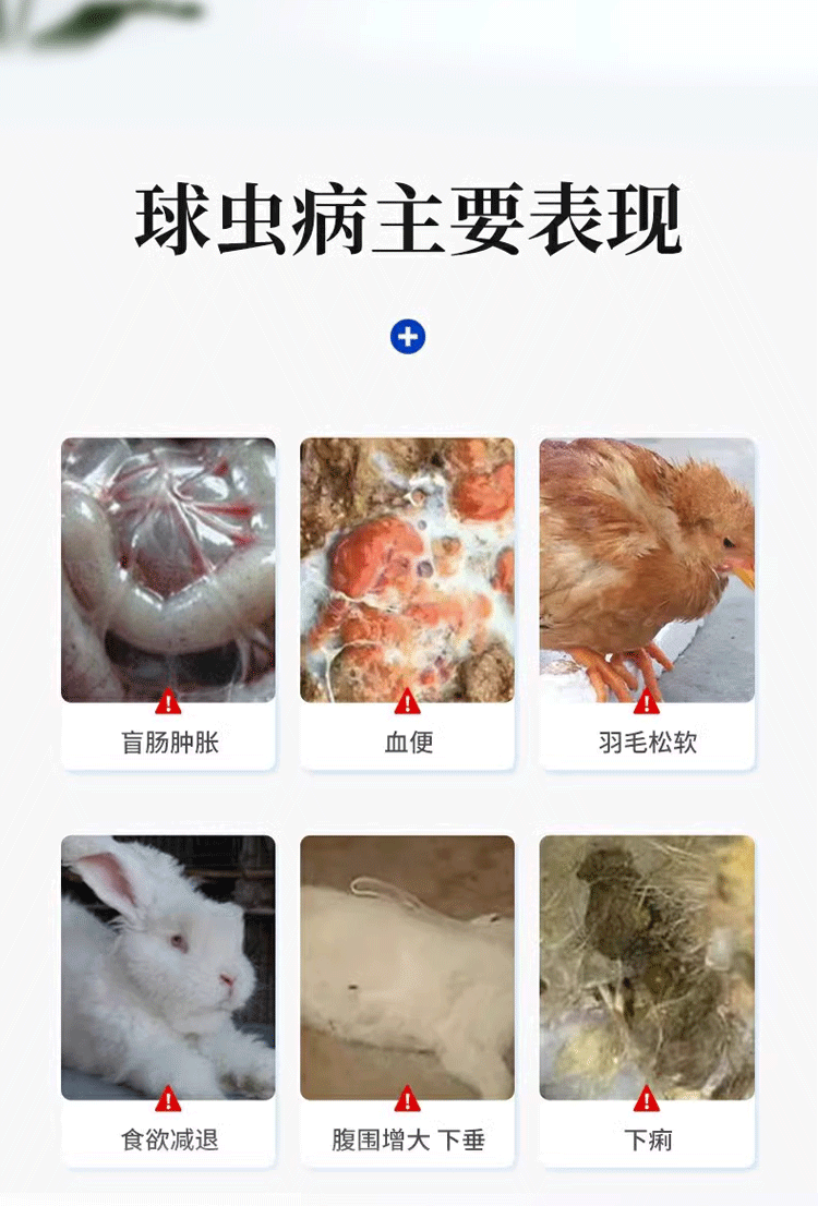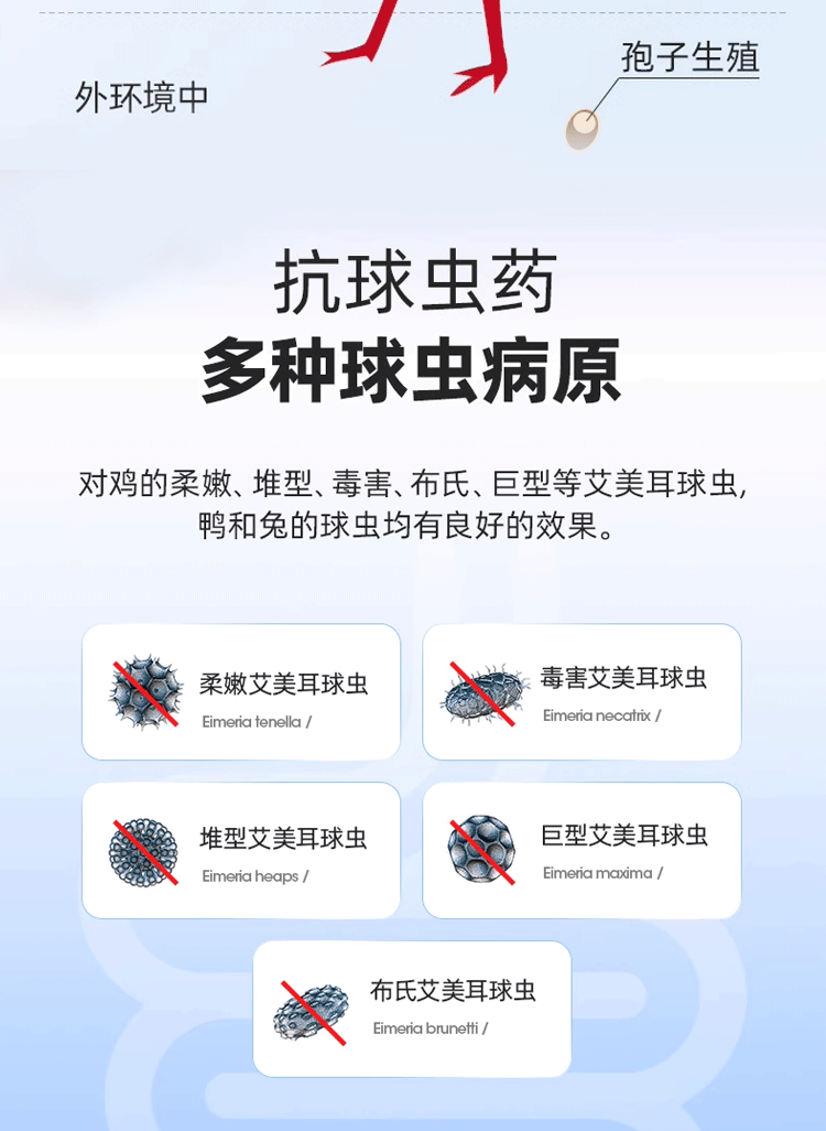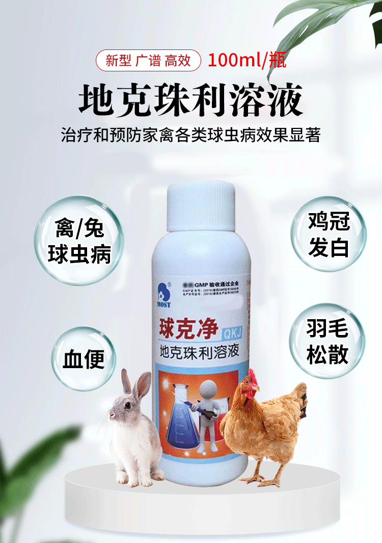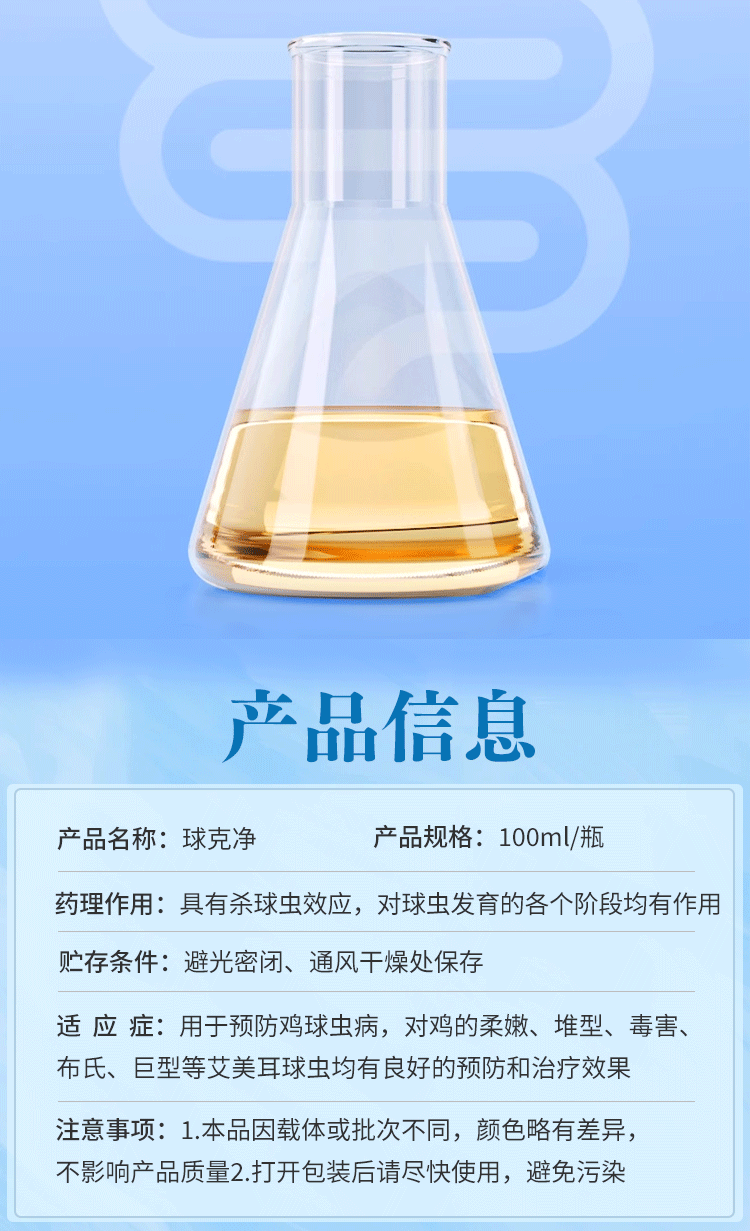 產品簡介:用于預防雞球蟲病,對雞的柔嫩、堆型、毒害、布氏、巨型等艾美耳球蟲均有良好的預防和治療效果。
