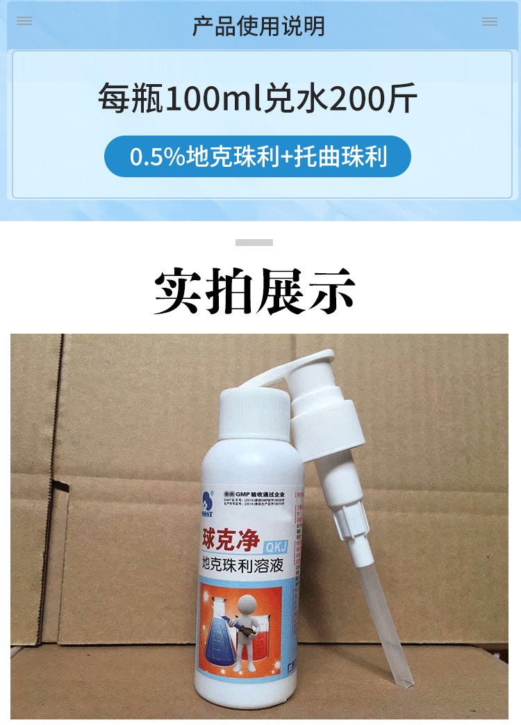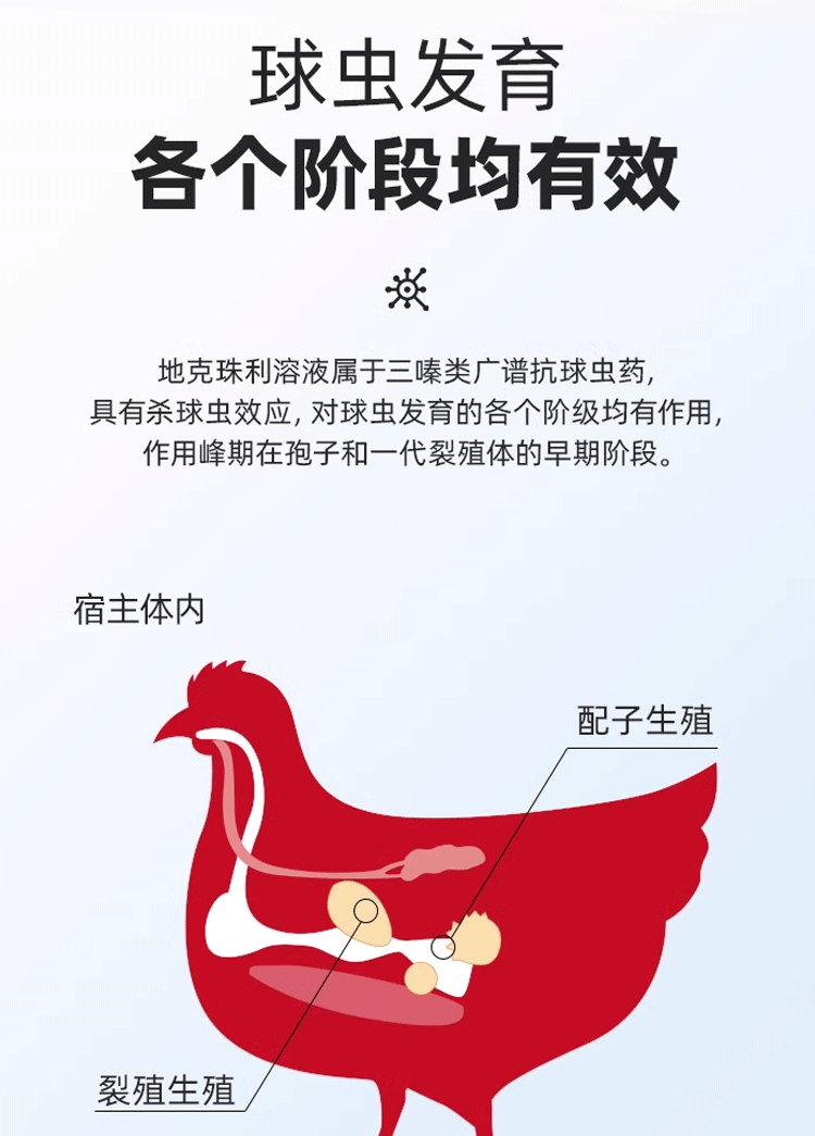【用法用量】以地克珠利計.混飲:每1L水,雞0.5- 1mg(即100L水,用本品10-20ml)。