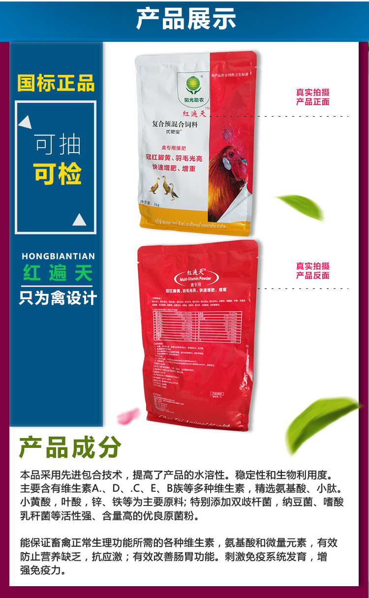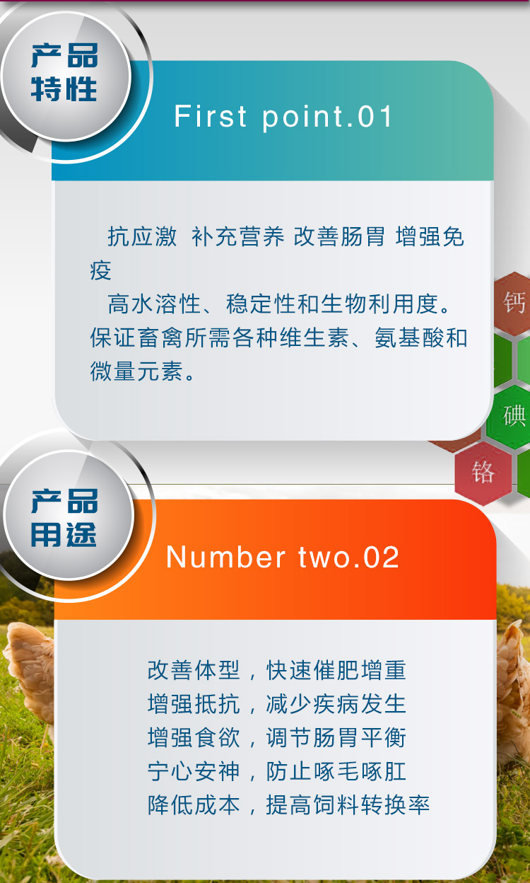 產品簡介:保證畜禽正常生理功能所需的各種維生素,氨基酸和微量元素,有效防止營養缺乏,抗應激;有效改善腸胃功能,刺激免疫系統發育,增強免疫力。