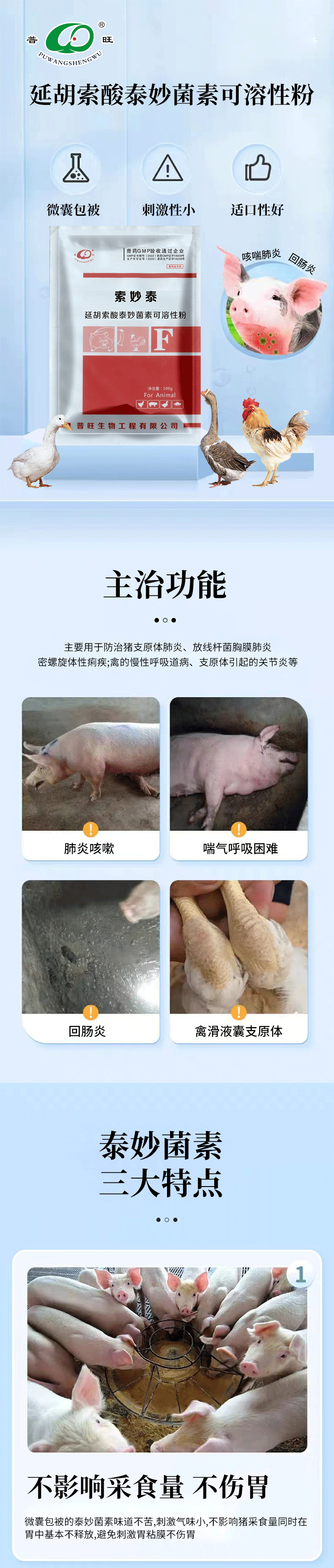產品簡介:主要用于防治豬支原體肺炎、放線桿菌胸膜肺炎 密螺旋體性痢疾;離的饅性呼吸道病、支原體引起的關節炎等